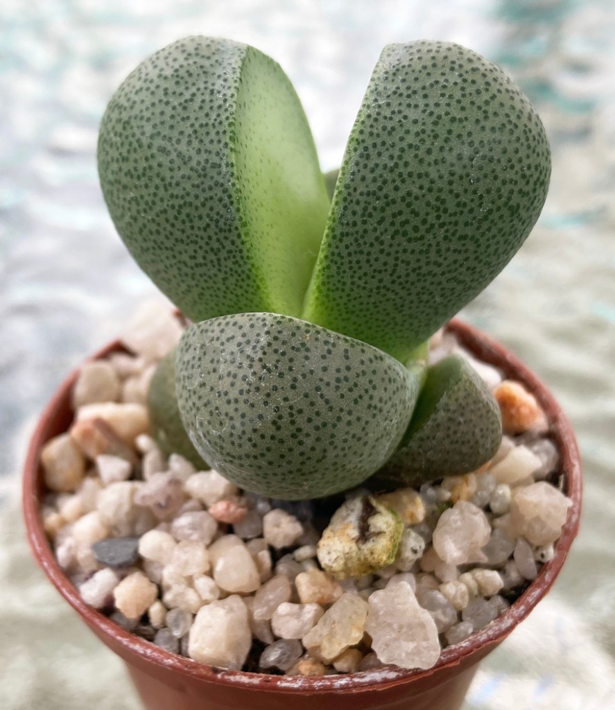 Also called “Split Rock Plant”, due to its appearance, which evolved so as to blend in with its native semi-arid South African environment. Resembles lithops (aka “Living Stones”.)